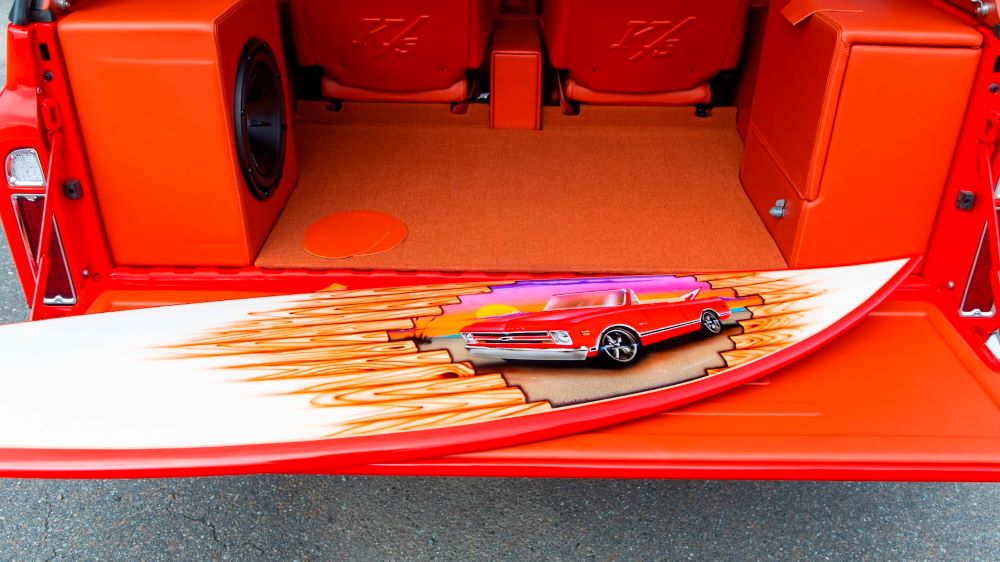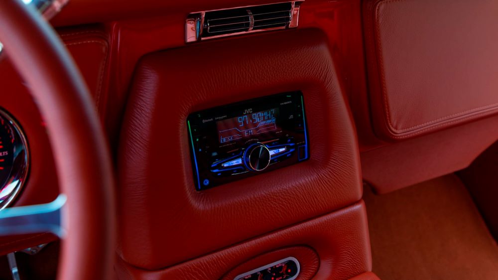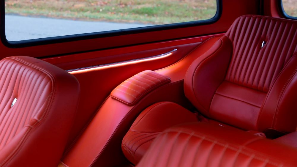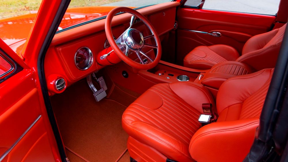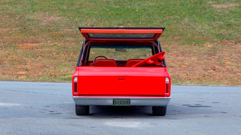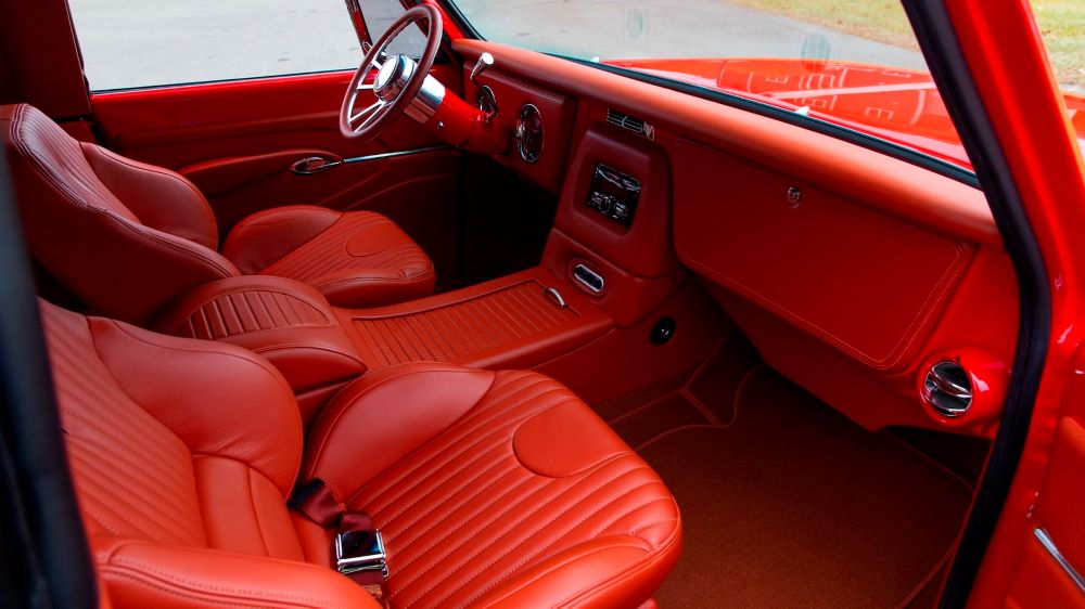 That all starts on the outside, where the hunkered-down body wears a host of changes. Including an earlier ’67 Blazer front end that looks right at home. The rest of the body has been shaved, yet a few trim pieces remain. The whole thing was then covered in a custom red hue contrasted by the black fiberglass top. And instead of knobby tires underneath, this one wears staggered 22-inch rear and 20-inch front Billet Specialties wheels wrapped in Michelin Pilot Sport tires.