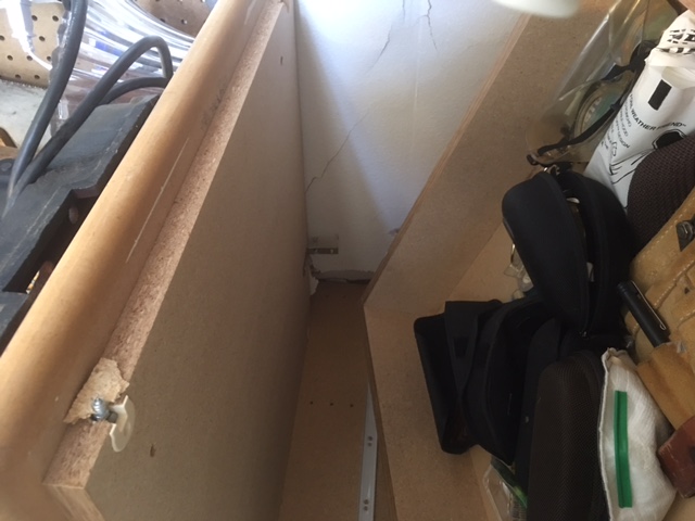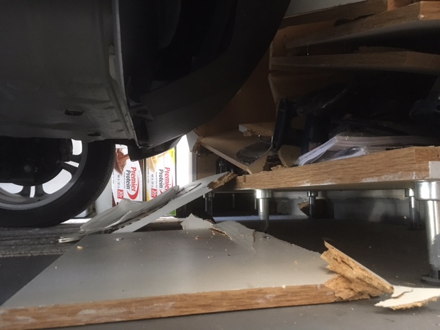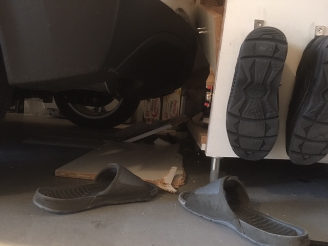 Wife heard a crash, goes to the garage and sees that the car backed up and ran into a work bench, pushing in a wall.
