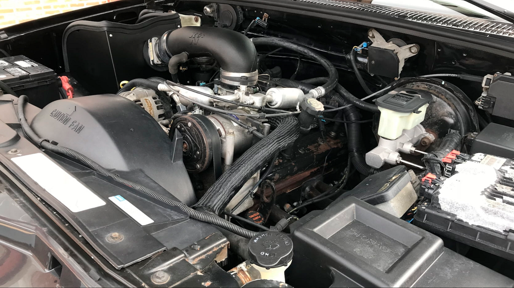 Plus, who wouldn’t want to sit inside that plush diamond-pattern interior? Stitched up in contrasting black and dark red, it’s more like the kind of thing you’d see in a modern-day luxury car. Not a rough and tumble old school SUV. And we’re guessing that it sounds pretty good with a K&N cold air intake (and other, unnamed mods) under the hood.
