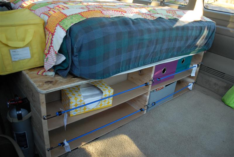 As of now, the van has a bed frame with an abundance of storage underneath, a kitchen unit with a sink, many handy places for extra storage, a back-up camera, and much more. He has added an additional cargo box to the rear hitch, bolted on some nice pockets to the door panels, and added a pull-out table to the bed frame.