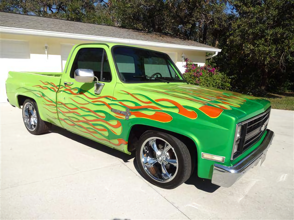 With eye-searing paint and massive chrome wheels, this isn’t your average C10.