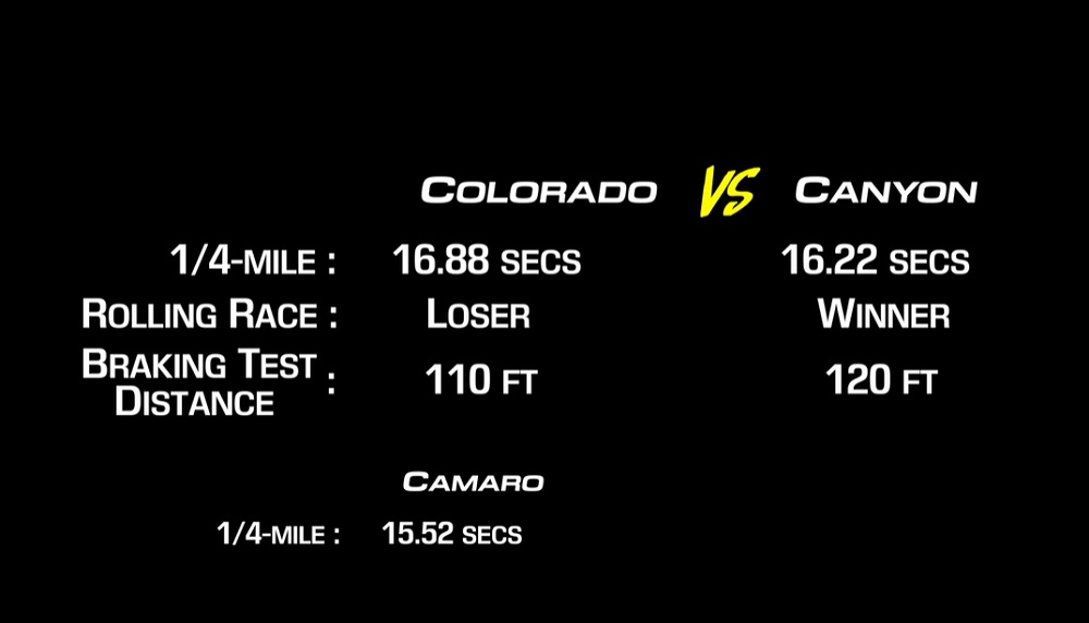$8,000 for a little over six tenths of a second in the quarter. That equates to about $1,300 per tenth of a second. And really unless you find yourself in a drag race like this, the performance is so close that the average driver would probably not feel that either truck has any perceptible acceleration advantage. The Colorado also lost the roll race to the Canyon but again it is close enough that unless you were running the trucks side by side, you would likely not notice. The Colorado did steal one victory though as it stopped from 60 mph in 110 feet compared to 120 for the Canyon.