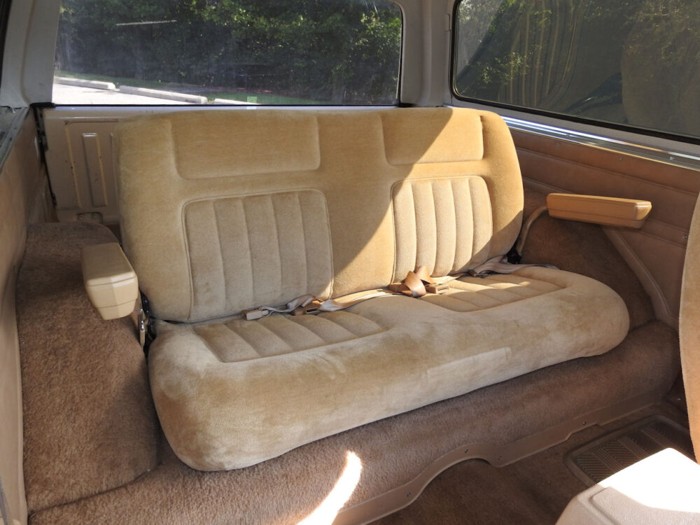 Inside the Jimmy, the interior is a warm, cushy place to be, with plush tan buckets up front, a cozy bench in the rear. The console storage is lockable to protect your valuables, the gauges are all new, and there’s a period-correct aftermarket AM/FM radio with cassette. So, yeah, you can dust off your Guns n’ Roses, R.E.M. and Exposé tapes.