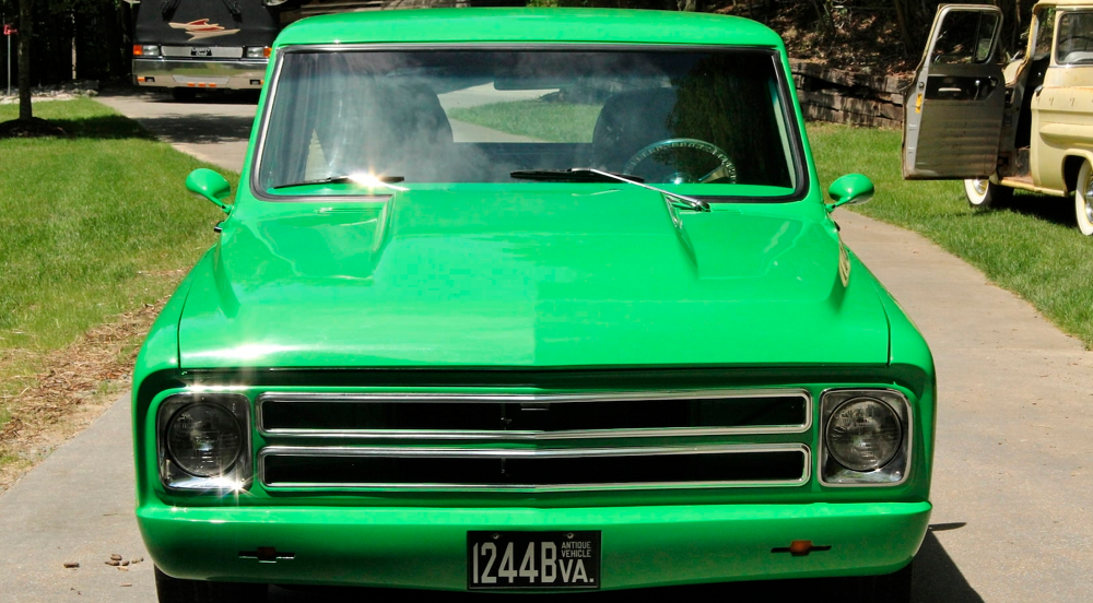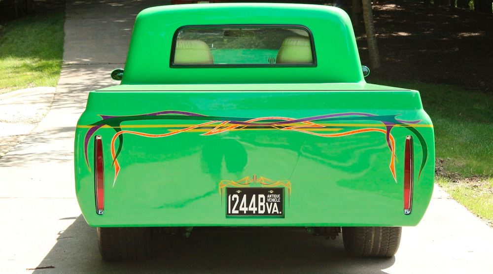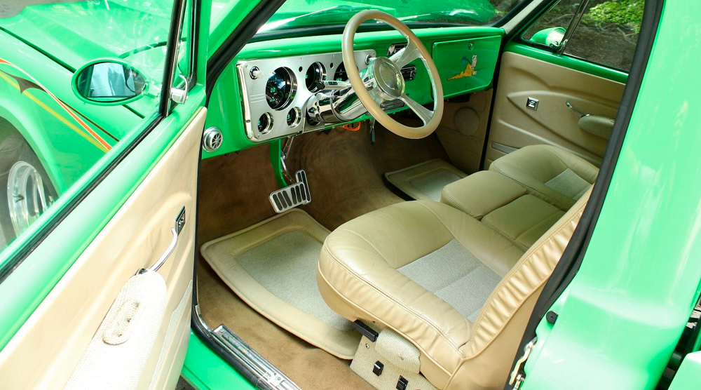 That certainly applies to this blazing green Chevy C10, that’s for sure. It checks all the Pro Street boxes, from bright paint to a completely smooth body. There are graphics, massive rear tires, and even some tiny little side mirrors. There isn’t much tweed on the inside, but it’s there. And there’s just enough billet aluminum to qualify.