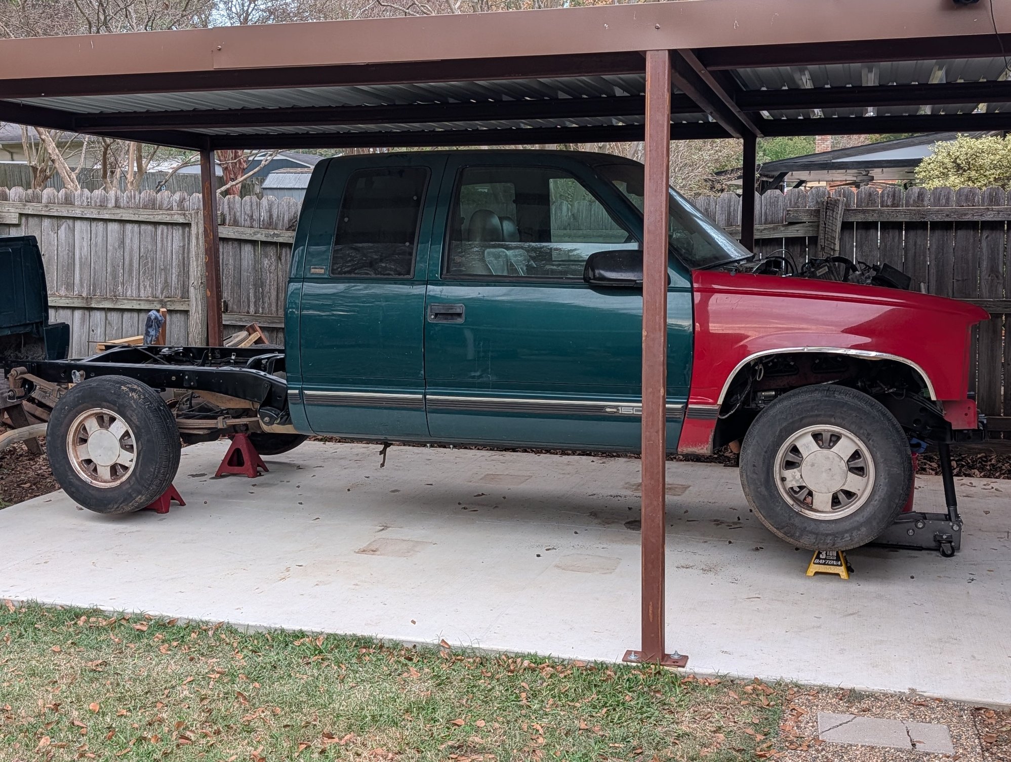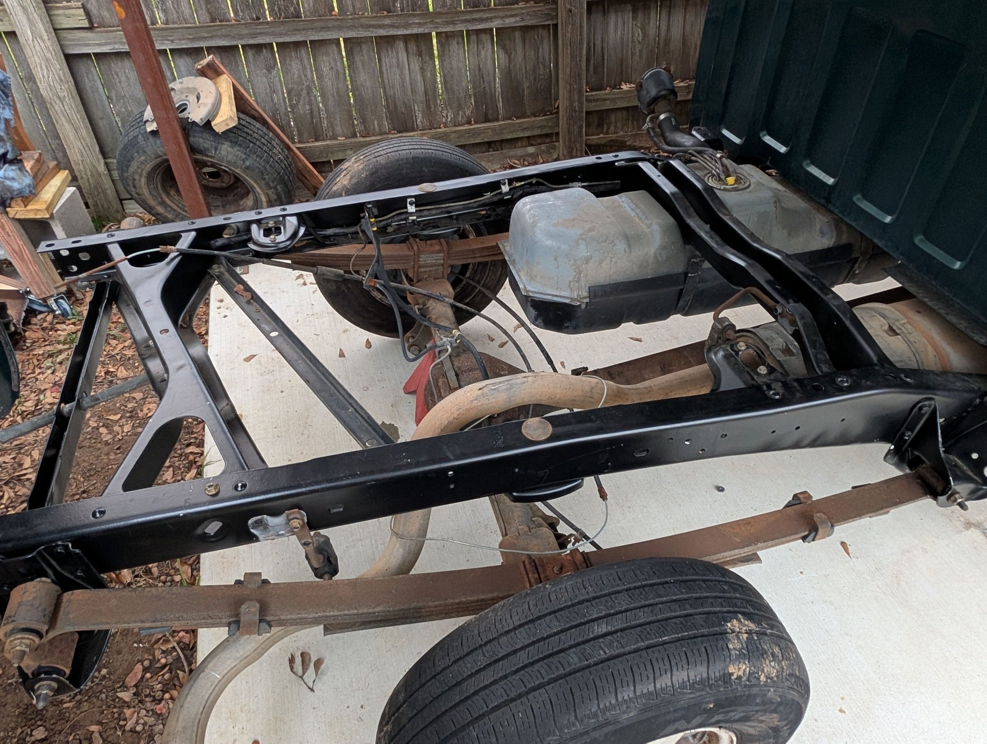 Made some more progress today. Cab is officially sitting on the frame with all new body bushings. Rear brake line, fuel lines, driveshaft, are all hooked up. Hopefully tomorrow weather pending, I will have the bad back on and everything buttoned up. Test fitted the pass fender and so far, it lines up perfectly. I am hoping the drivers side will line up as it should too.