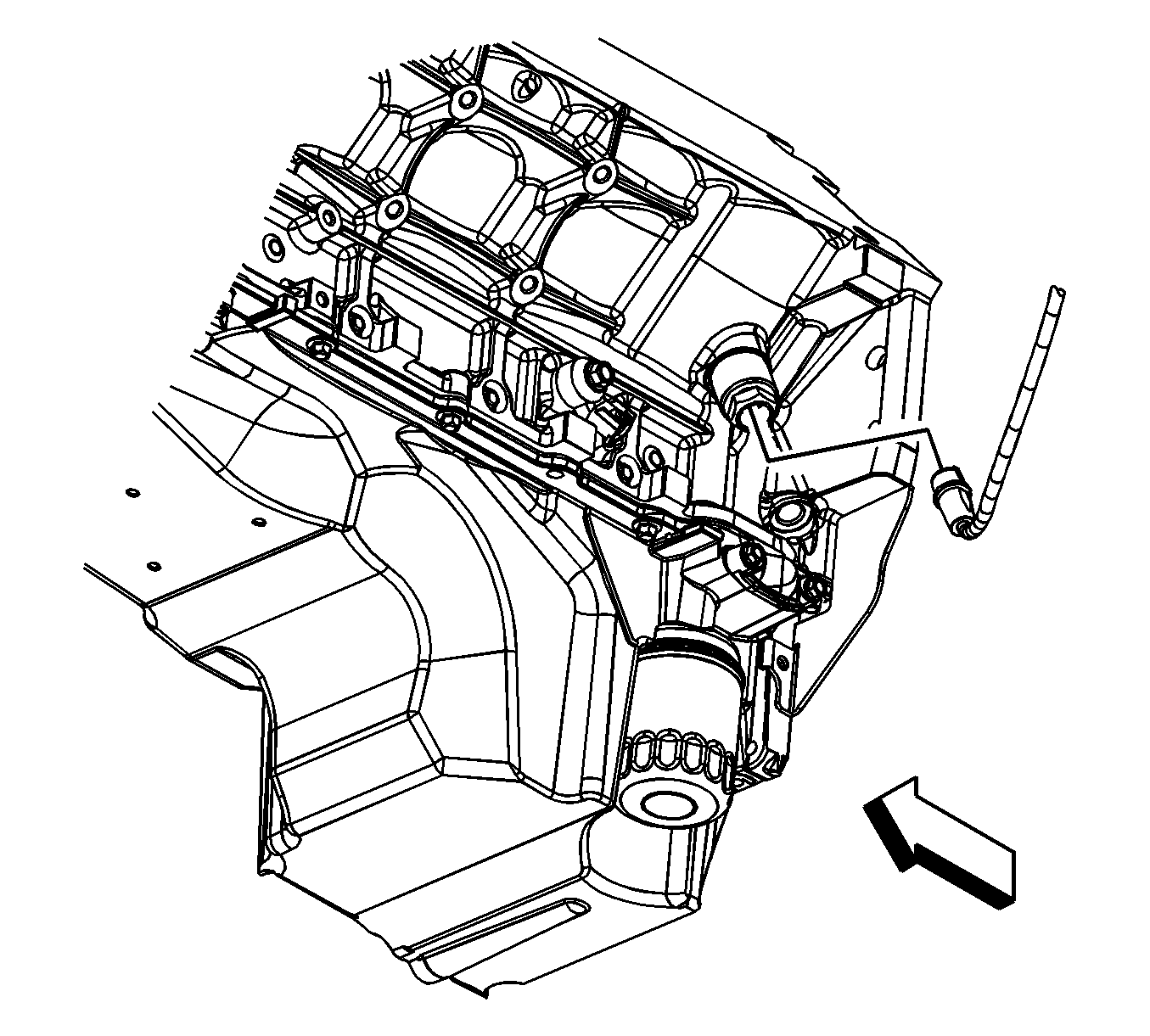arrow points to the front, so you're looking at the bottom drivers side, rear (the end by the firewall) The cylindrical object right below is the oil filter.