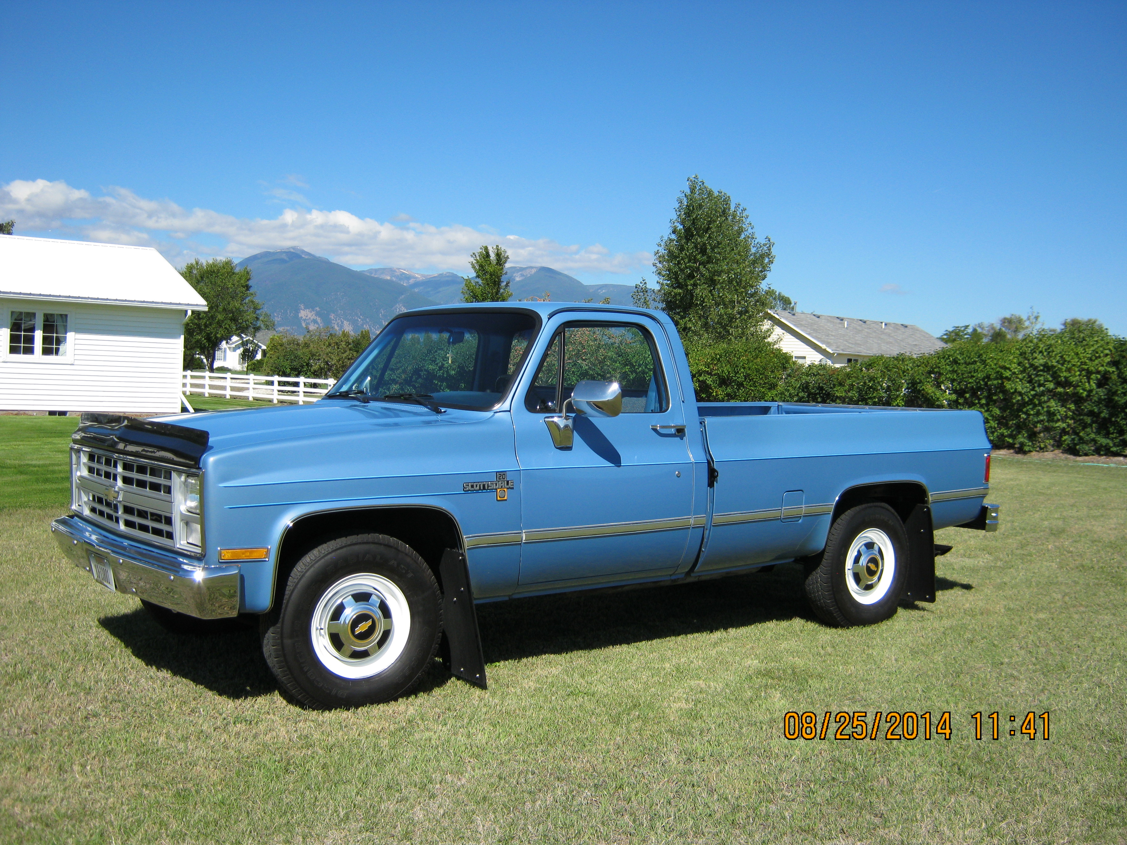 I just wanted to say "Hi" to everyone. My husband and I are the proud owners of Big Blue, an "87" HD R20 2 wheel drive, 350 V8 pickup. We show her in the local car shows in our area. Everything is the same when we bought her in 1987 from Frontier Chevy in Billings, MT. She has pulled and hauled our RVs and Hewes Craft boat throughout the years. She even pulled loads over from Eastern Montana when we moved to the Bitter Root Valley. She is all original and is showroom condition.