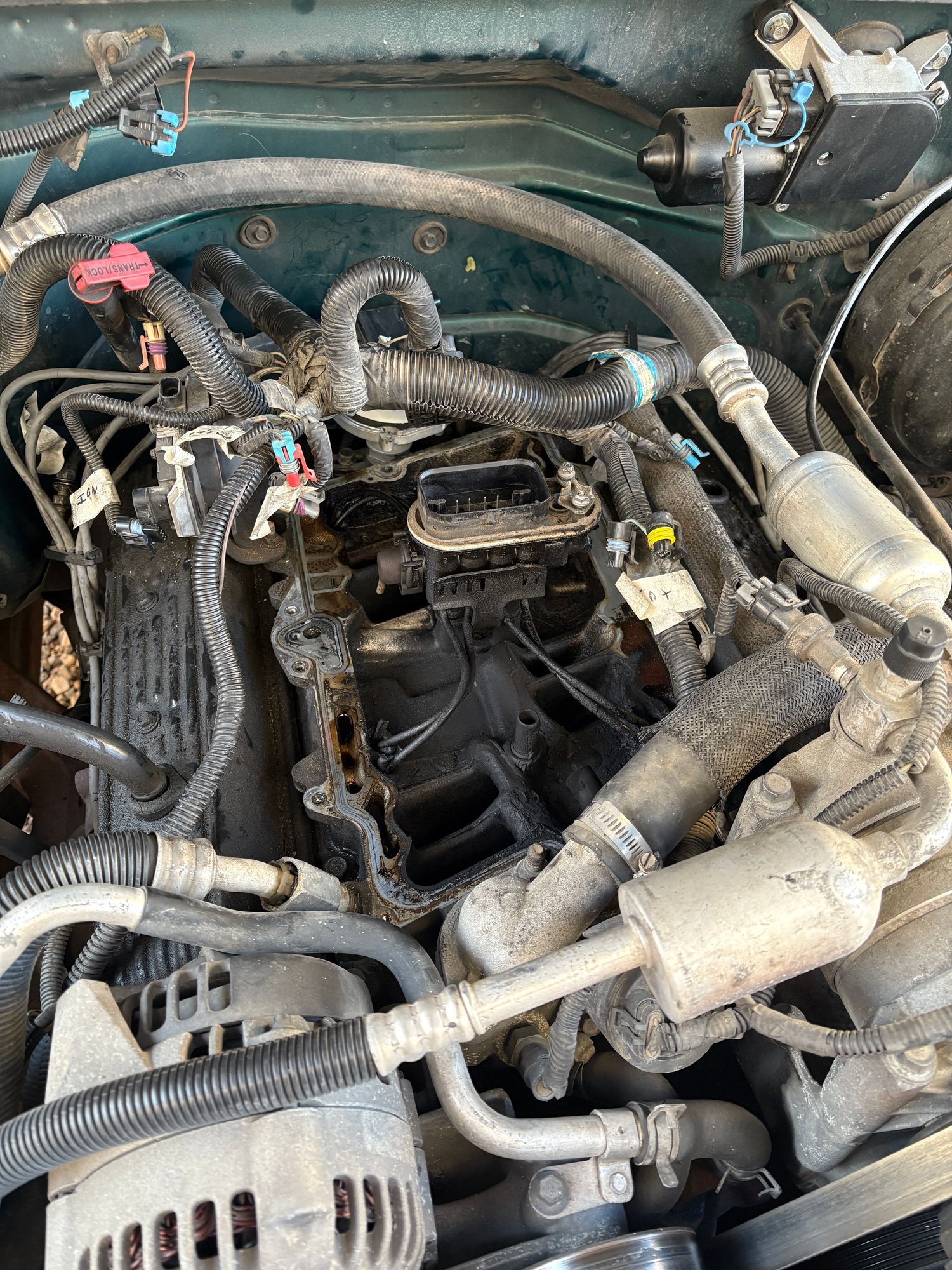 I have the top of my intake manifold off for a repair, and its pretty dirty. Is this normal? The truck has over 200K miles on it. I know that their is emissions stuff like pcv valve and such, is their also exhaust gas that enters the intake on the 5.7 vortecs? i just want to make sure I am doing all necessary repairs while I have so much taken apart on this motor right now. Thank you. In this photo I was just pointing at a clean spot. It is because this fuel pressure regulator is bad. I have the manifold off to replace the fuel injector spider. You can see how dirty it is. I think there is even a little oil in some spots.