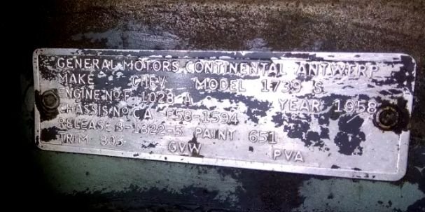 It seems, according to the manufacturing plate, this Chevy was made by General Motors Europe in Antwerp, Belgium in 1958. There was no model identification in the car nor in the plate. I took some photographs and I wonder if anyone could possible identify the model of this dying vintage Chevy.