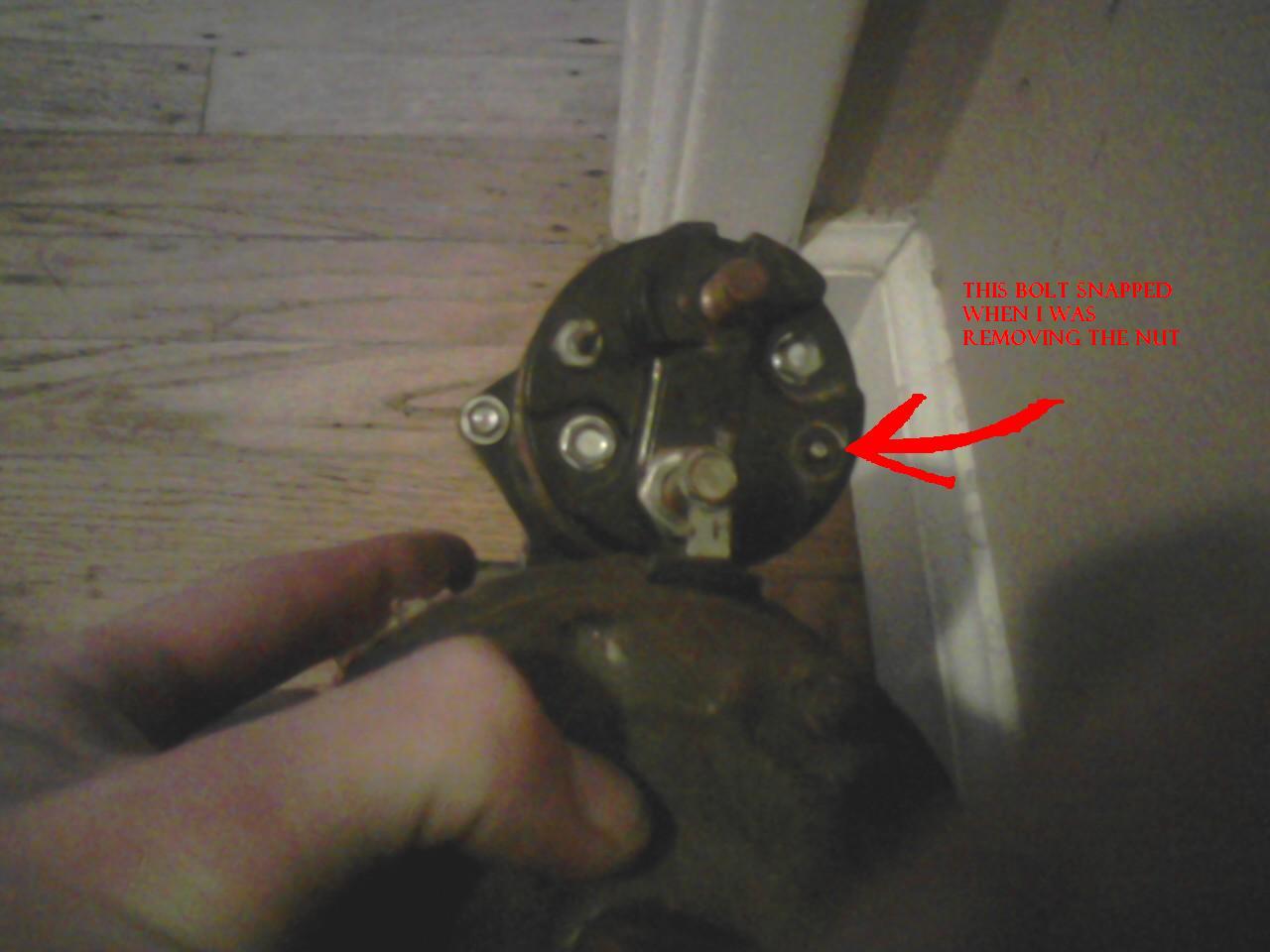 everything went fine removing the starter, except when i went to remove the smaller nut with the small wire (ground??) where the wire had been old and brittle, i had the wire snapped in half with metal eye connected to the bolt. when i attempted to remove the nut, the bolt just snapped and there is nothing protruding to re attach this wire to after i re-connect the metal eye.