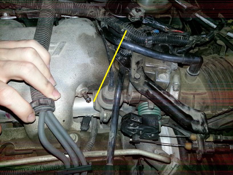 Here is the first one. This is on the front side of the engine. It is (I think) a line for the evap system, and my code reader now detects a P0442 code "EVAP System Small Leak Detected".