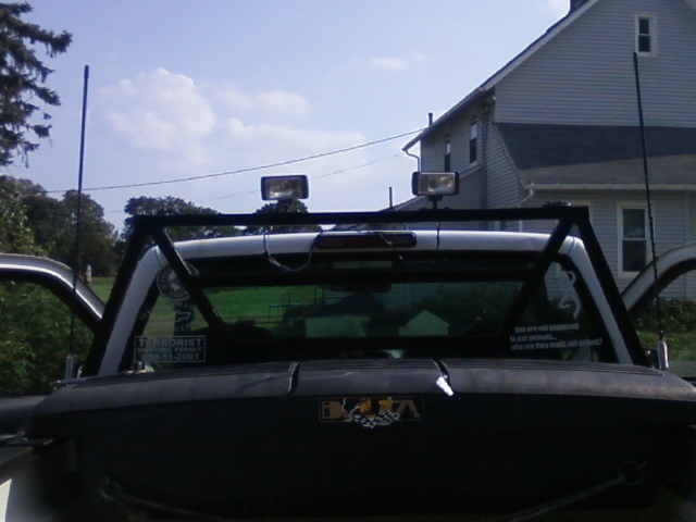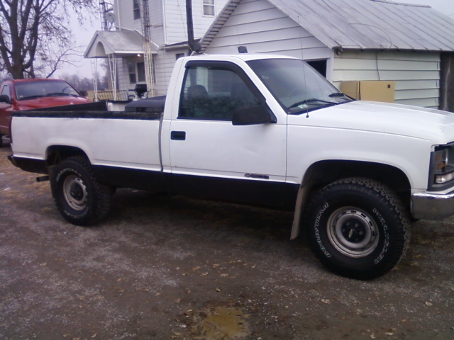 this is my truck throughout the various stages of modifications. everything u see i have done myself. it has a 3 inch lift up front thru torsion bar keys. 3/4 ton leaf springs in the rear. 285/75/16 retread tires. the small brush gaurd i built in high school. the big one i built last winter after i hit a deer at 70 mph. the headache rack i built myself and the lights are hooked up to my turn signal and brake lights. i the black u see on the bottom and along the bed rails is bedliner that i did myself also