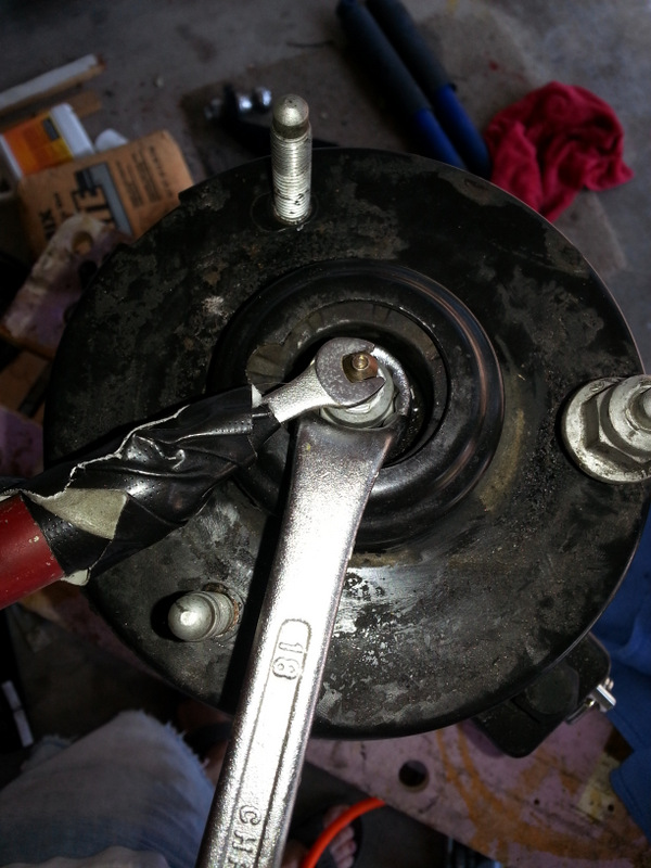 6mm open end wrench (taped inside a 1/2 pipe for leverage) to hold the strut shaft from spinning while top nut was removed.