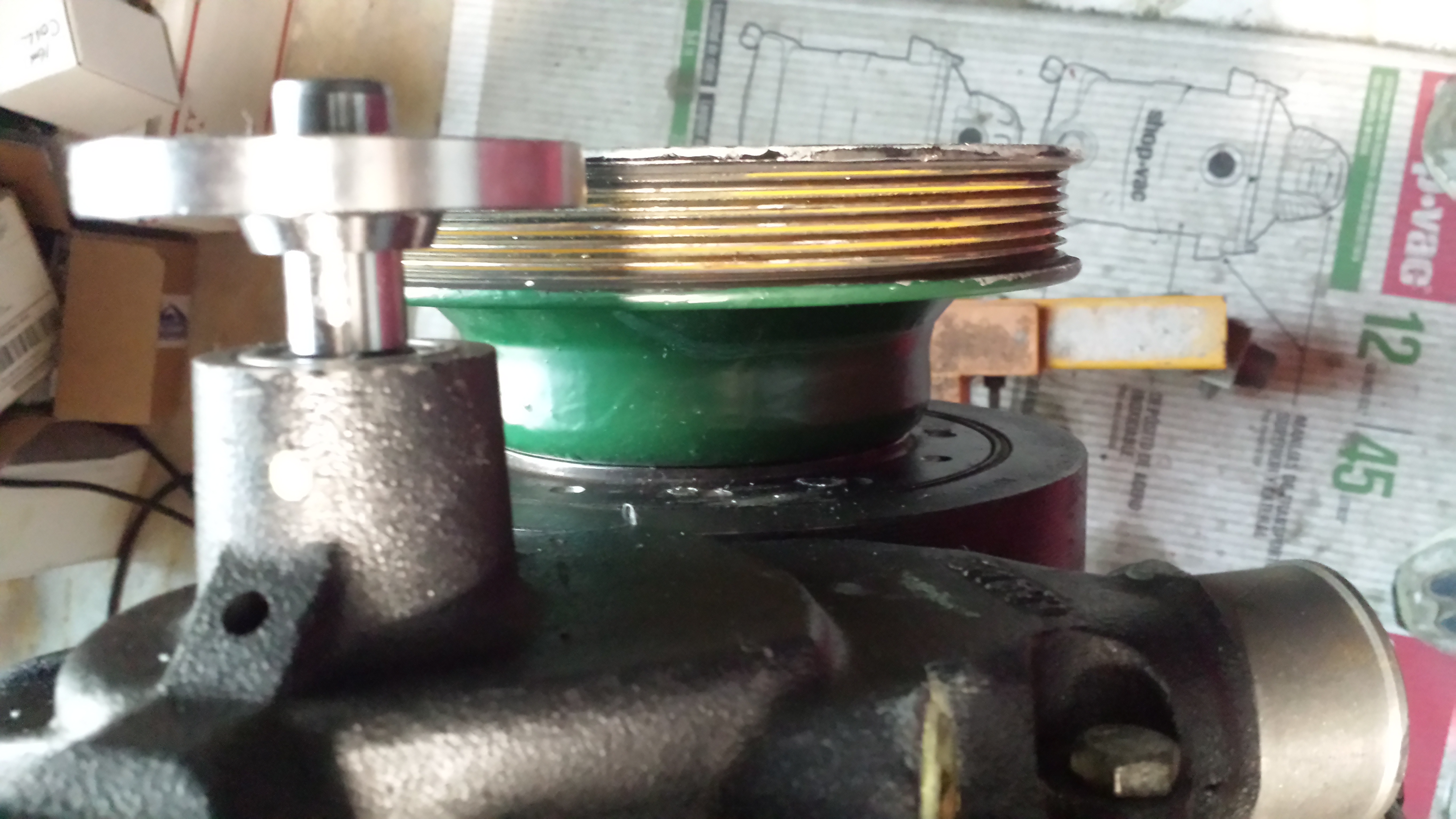 I rebuilt and marinized a 98 Chevy Suburban 5.7 vortec for my boat. The only marine water pump I could get was the short style which will not fit the smooth water pump pulley off the vortec. I would prefer a ribbed pulley anyway and since I only need water and alt, I won't need to use a serpentine belt. I assume this is not a reverse flow engine so that should not be a problem. I attach a picture to show the alignment problem. One picture shows the old and new pumps.