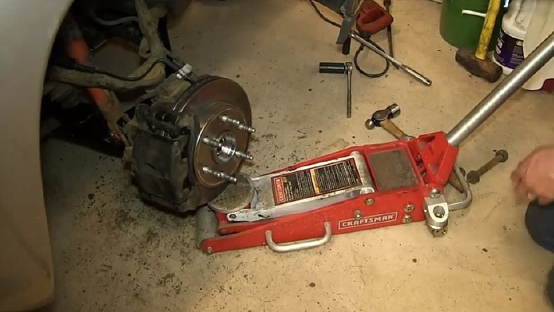 - Place the floor jack under the wheel knuckle, and lift it up to a point where its tire would be contacting the road.
