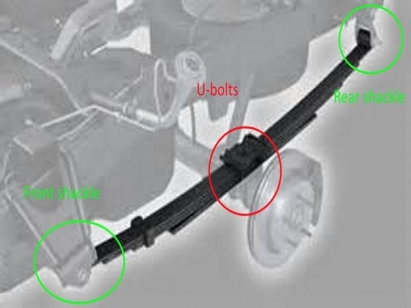Two U-bolts secured by nuts hold the leaf springs to the rear axle. The leaf spring itself is held onto mounts attached to the frame rail by one bolt at each end.
