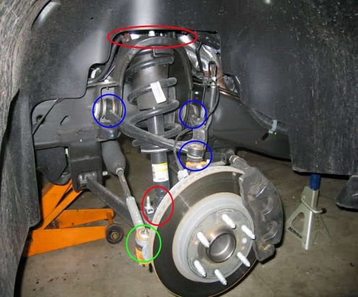 Figure 4. The front strut nuts and bolts (red circles) will be removed. The tie rod (green circle) will be removed in the next step. The upper control arm bolts/upper ball joint are circled in blue.