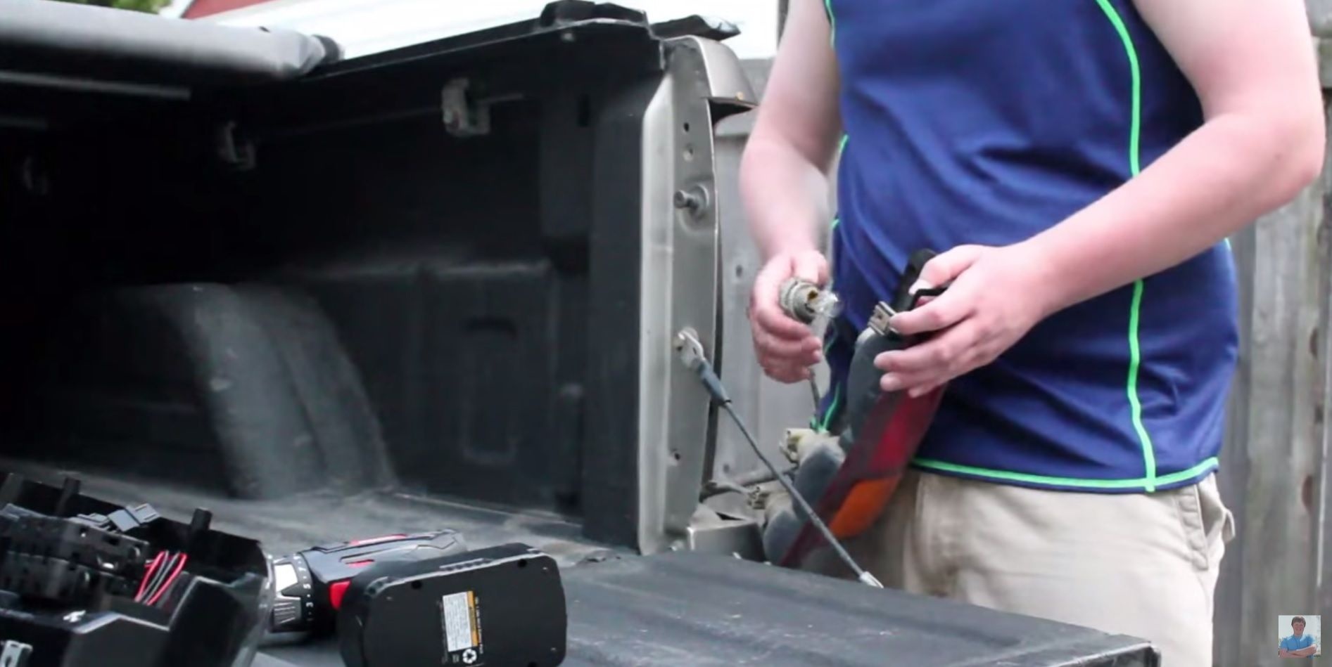 Use a drill to remove the two bolts which hold each tail light in place. Lift the tail light assembly away from the truck and unplug the three bulb wiring harnesses by turning them and then pulling outward.